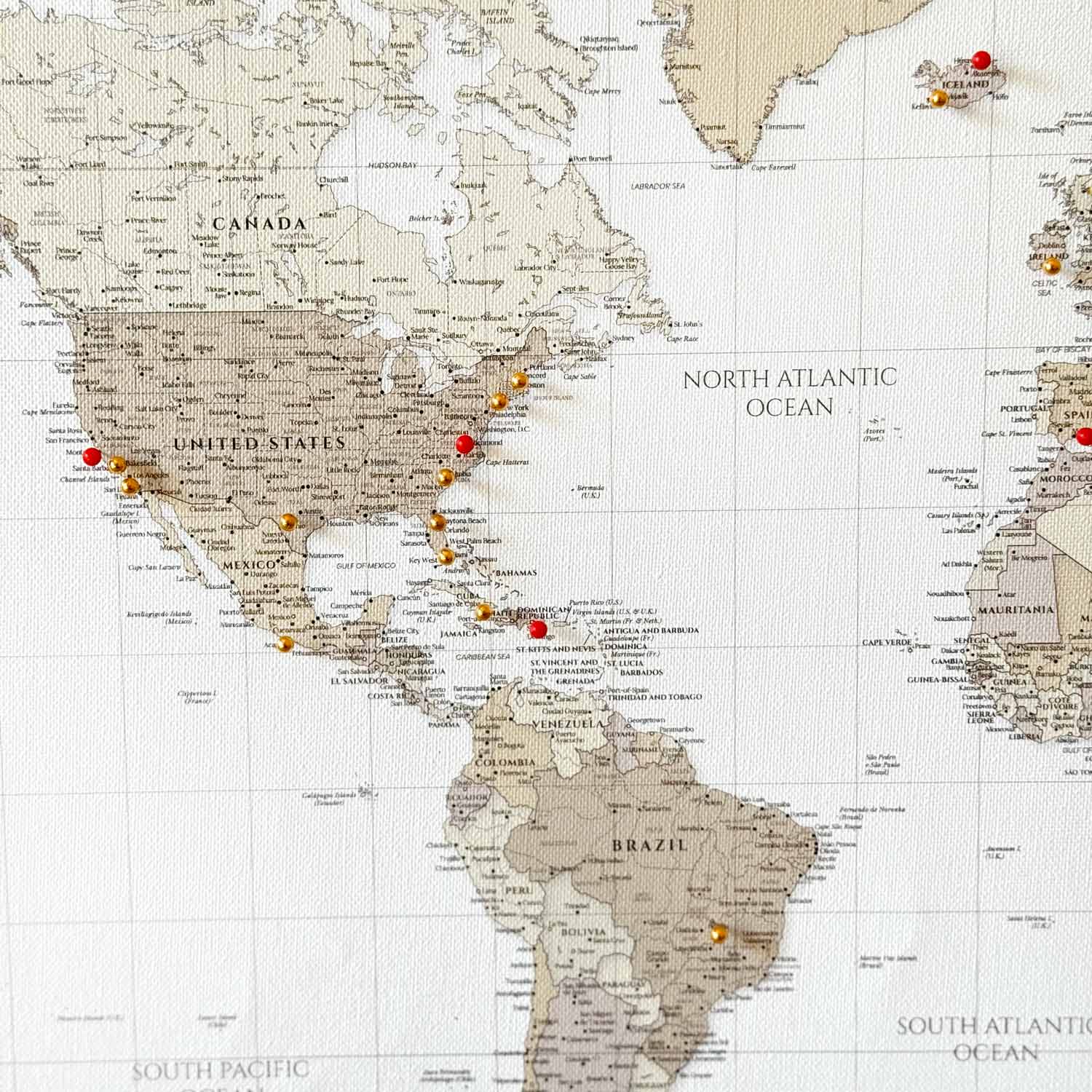 Our World Map with Pins lets you mark the countries, cities, or landmarks you’ve visited — and dream about where you’ll go next. Add a soft, stylish touch to your space with the World Map with Pins. With elegant pastel tones and high-resolution UV printing on durable canvas, this map is both decorative and functional. Use it to pin photos, plan adventures or mark your travels.