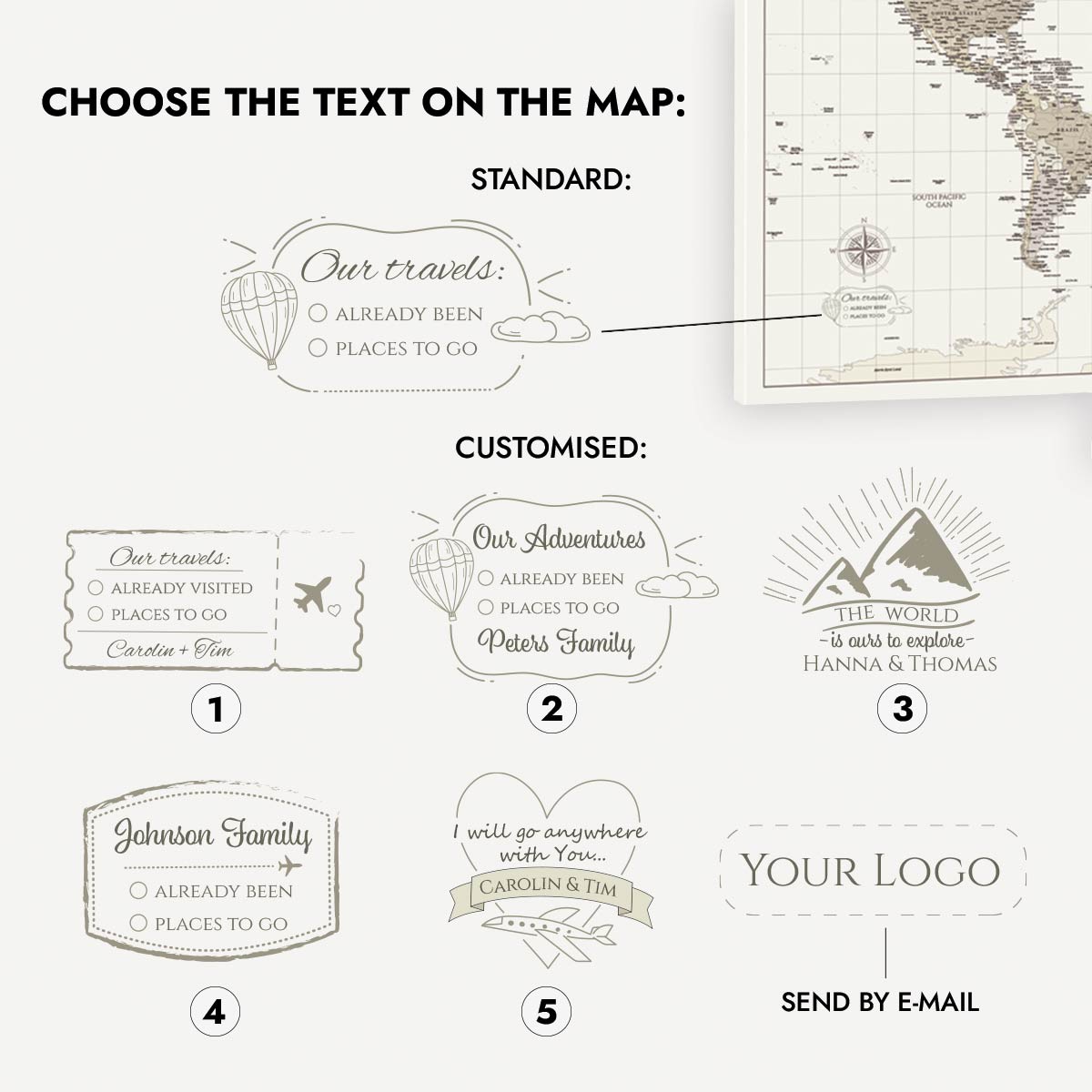 Personalise your map – add your own text or company logo, or choose one of our 5 exclusive design templates!